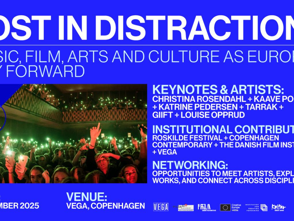 NYT FRA CREATIVE EUROPE Call: Kandidater til Rotterdam Lab Producers & Creators 29. sep 2025. TRAINING. Filminstituttet skal indstille to nye producere og en ny instruktør til workshoppen Rotterdam Lab, der finder sted 31. januar – 4. februar 2026 under International Film Festival Rotterdam… Filminstituttets opslagstavle for branchen 17. sep 2025. VIDSTE DU at Filminstituttet har en online opslagstavle for branchen? Mød de skandinaviske MEDIA Deske på Nordisk Panorama 16. sep 2025. Den 36. udgave af kort- og dokumentarfestivalen Nordisk Panorama er netop startet. Under branchedelen Nordisk Panorama Forum har du mulighed for at møde de skandinaviske MEDIA Deske. Beta testing of the Carbon Calculator 05. sep 2025. Be Part of the Change: Join the Public Beta of the MEDIA Carbon Calculator! Testing of the tool is now available for professionals, without pre-registration. Deltag i kulturkonferencen Lost in Distraction? 03. sep 2025. KONFERENCE. Den 3. november slår vi dørene op for EU-formandskabskonferencen Lost in Distraction? med invitationen til at gentænke kulturens og kunstens rolle som Europas vej frem. Co-Creators til MediaTech SPRINT 2025 i København 20. aug 2025. Har du erfaring med forretningsmodeller og -udfordringer, som andre kunne have gavn af? Så tilmeld dig som "Co-Creator" til årets MediaTech SPRINT senest d. 15. september. Ny database over salgsagenter 26. jun 2025. Find din næste salgsagent med ny søgbar guide. SAVE THE DATE: Lost in Distraction? 26. jun 2025. KONFERENCE. Den 3. november slår vi dørene op for EU-formandskabskonferencen Lost in Distraction? Music, Film, Arts and Culture as Europe's Way Forward. Kom til gratis visning af nyrestaureret klassiker 25. jun 2025. A Season of Classic Films 2025 - restaurering af den europæiske filmarv. Åbent for ansøgninger: MediaTech SPRINT 2025 i København 10. jun 2025. Nu har du igen muligheden for at deltage i innovations-workshoppen MediaTech SPRINT, som i år afholdes i København i forbindelse med Picture This. Der er ansøgningsfrister hhv. 27. juli og 15… ‹ Previous 1 2 3 4 5 6 Next › Nyhedsbrev Tilmeld dig nyhedsbrevet