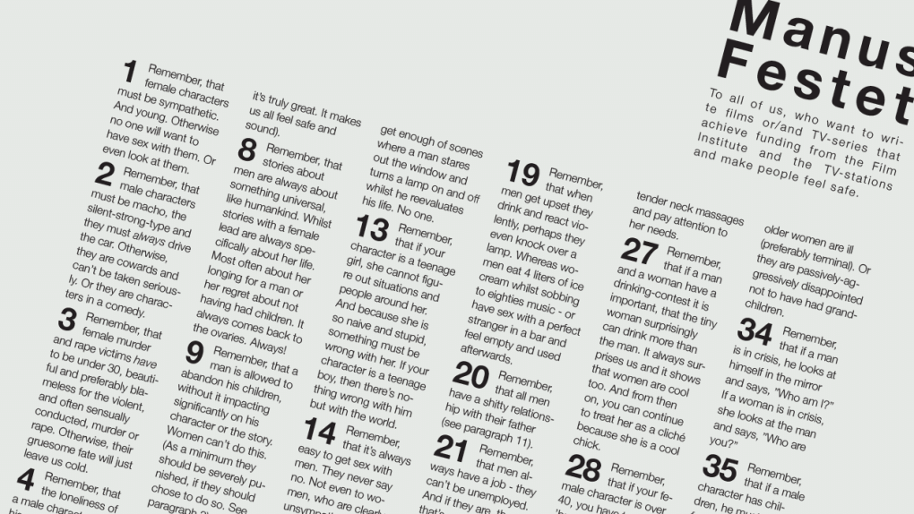 Tongue-in-cheek advice such as this make up the list of 40 points in the ManusFestet, a satirical manifesto created by the Danish Playwrights’ and Screenwriters’ Guild "to all of us who want to write films or/and TV series that achieve funding from the Film Institute and the TV stations and make people feel safe".