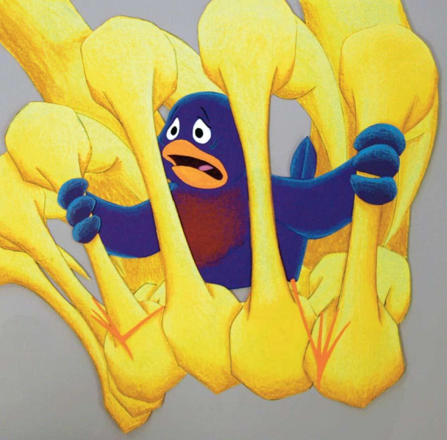 Fremstillingen af tegnecellerne afviger fra den traditionelle 'Disney'-stil, hvor cellerne er fremstillet ved at bemale transparente acetatplastark direkte med akrylfarve. Figurerne i "Fuglekrigen i Kanøfleskoven" er efter forarbejdet med skitsetegningerne fremstillet ved hjælp af collageteknik, hvor farvet karton er klippet ud og monteret med dobbeltklæbende tape på acetatplastark. Filmens figurer er farvelagt med oliepastelkridt, tusch eller akrylfarve. Fødder, museknurhår m.m. er desuden malet direkte på acetat med akrylfarve. Enkelte celler er fremstillet ved traditionel teknik ved direkte bemaling med akrylfarve på acetatplastark. Foto: DFI Billed- & Plakatarkiv