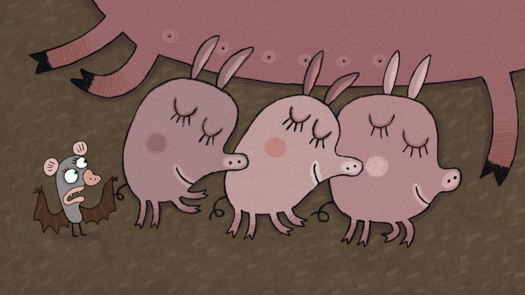 Dyrene på bondegården er sammen hele dagen – bortset fra flagermusen, som er et natdyr. Den vågner først rigtigt op, når det er blevet mørkt. Så er alle de andre dyr faldet i søvn, og der er ikke nogen at lege med. Men der er et andet dyr, som heller ikke sover, og det er heldigvis i legehumør.