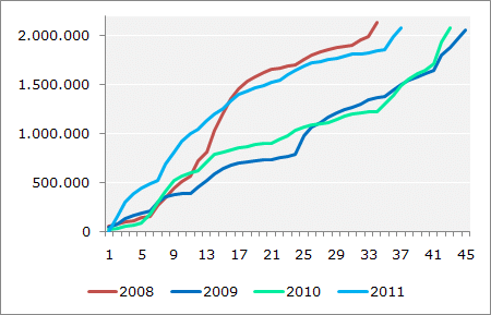 I år runder dansk film de 2 millioner solgte billetter allerede i uge 36, hvilket er det bedste resultat siden 2008. I 2009 og 2010 nåede billetsalget for danske film de 2 millioner i henholdsvis uge 45 og 43.