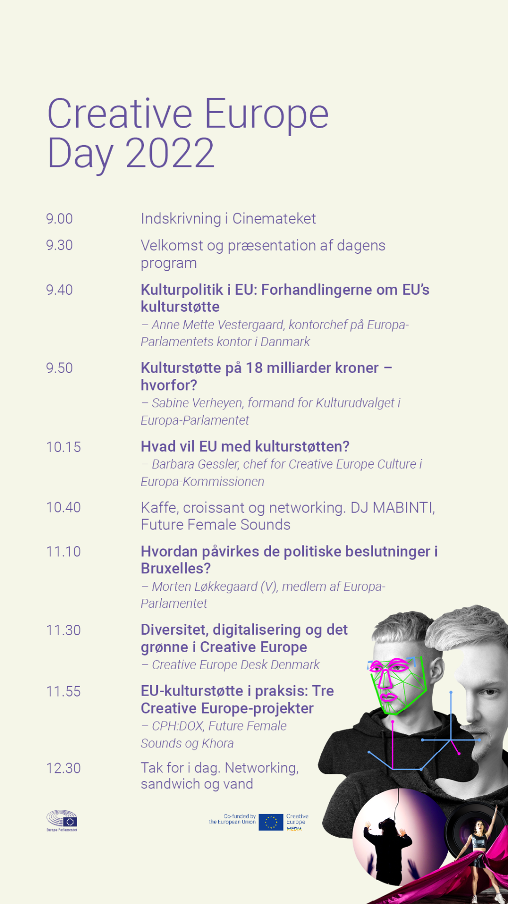 Få svar på alt dette og mød repræsentanter fra Europa-Parlamentet, Europa-Kommissionen og Creative Europe-støttede kulturprojekter til oplæg, samtaler og paneldebatter.