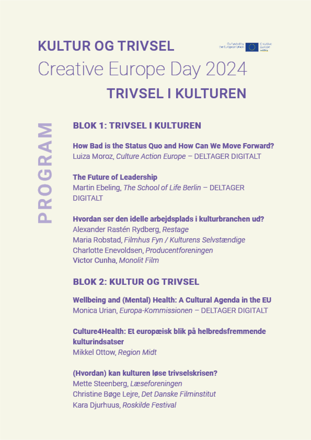 Derfor sætter vi til dette års Creative Europe Day fokus på europæisk kulturstøtte i krydsfeltet mellem kultur, trivsel og social bæredygtighed - såvel på publikumsrækkerne som bag kulissen - og stiller spørgsmålene: