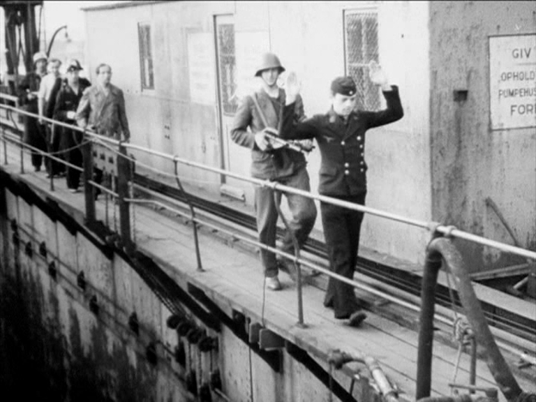 af andre Optagelser, som virker ved autentisk Styrke, skal vi nævne en Afvæbning af to tyske Soldater på aaben Gade i København. Nogle faa Frihedskæmpere ledsaget af en Filmfotograf holder to tyske Soldater og en Kvinde op og fratager Soldaterne deres Vaaben. Episoden virker så meget mere fantastisk, fordi Folk på Gaden ikke engang standser op, men roligt og uanfægtet gaar videre.[1]